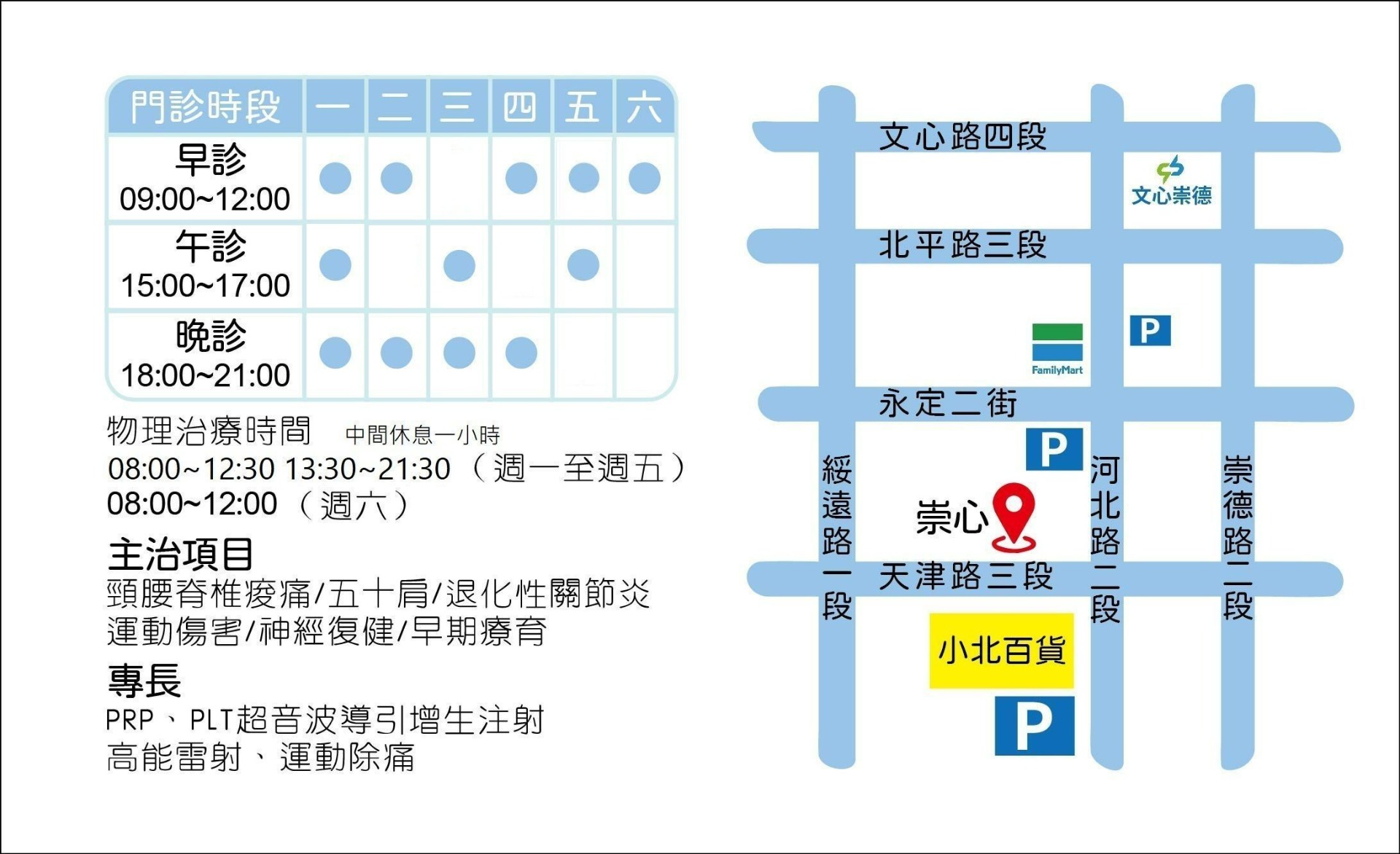 復健治療主要為提供腰、肩頸痠痛(椎間盤突出、坐骨神經痛、五十肩、落枕)、各類關節炎、運動傷害等